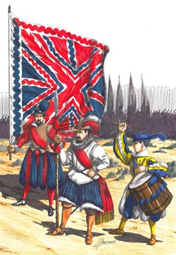 Eso precisamente sucedió a estos tercios: por estar en una zona débil del despliegue, los rebeldes los bloquearon con embarcaciones que ocuparon los brazos de los ríos de modo que les impedían recibir refuerzos y víveres ya que la comarca estaba devastada; además, provocaron inundaciones para que subiera el nivel de las aguas, lo que obligó a los infantes españoles, ante el bombardeo enemigo, a concentrar su defensa en la colina de Empel. La situación era literalmente la antesala de un desastre. Frío, hambre y la vergüenza de una derrota segura. Pero uno de los infantes, cavando para mejorar las defensas, encontró enterrado un cuadro con la imagen de la Virgen María que seguramente había sido escondido por holandeses católicos para salvarlo de la iconoclasia de los protestantes que no dudaban en ultrajar sus representaciones. Milagro, Milagro Antiguo mapa de Flandes Aquellos infantes atribuyeron con tanta fe su salvación a un milagro que la devoción a la Inmaculada fue extendiéndose entre los demás Tercios, a pesar de que algunos ya tenían otros santos patronos. Y el que un historiador no español como Parker haya dado el calificativo de milagroso a este episodio -también conocido como el Milagro de Empel- lleva a considerar que lo sucedido fue verdaderamente extraordinario e inicio justificado de un camino imparable de devoción general de la Infantería española. El Dogma de la Inmaculada Concepción A lo largo del tiempo, la devoción a la Inmaculada fue alcanzando tal grado de extensión e intensidad entre los españoles de toda condición que a Ella consagró España el Rey Carlos III en 1761 y la tomó por Patrona y Protectora, creando en su honor la Real y Distinguida Orden de Carlos III. Por aquella dedicatoria de Carlos III, el 8 de diciembre sigue siendo actualmente una de las Fiestas Nacionales de España. Con el tiempo, y como consecuencia de la extensión que la devoción de los españoles tuvo en el resto de la catolicidad, entre otros factores doctrinales, el Papa Pío IX proclamó el 8 de diciembre de 1854 el Dogma de la Inmaculada Concepción de María mediante la Bula "Ineffabilis Deus". Y en reconocimiento a la Iglesia española por su importancia en la proclamación de este Dogma, en 1864 la Santa Sede otorgó a los sacerdotes españoles el privilegio de vestir una casulla azul en su fiesta. En vista de la tradicional coincidencia de los Regimientos de Infantería en tenerla por Patrona particular, el 26 de julio de 1892 el General Inspector de Infantería, en representación de toda el Arma, solicitó al Ministro de la Guerra que se declarara a la Inmaculada la Patrona de la Infantería española. La iniciativa acabó felizmente el 13 de noviembre de ese año, cuando la Reina Regente Dª. María Cristina declaró mediante Real Orden (DO. 248) "Patrona del Arma de Infantería a Nuestra Señora la Purísima e Inmaculada Concepción, que ya lo fue del antiguo Colegio Militar y lo es de la actual Academia General y de un gran número de Regimientos". Numerosos Patronazgos La Inmaculada no sólo es la Patrona de la Infantería española sino que, por su influencia, en el ámbito del Ejército de Tierra, lo es también del Estado Mayor. Además, jurídicos, interventores, capellanes, farmacéuticos, veterinarios y los de Oficinas Militares también están puestos bajo su advocación. Como también innumerables localidades y corporaciones, tanto de España como de toda Iberoamérica. Acceda a la galería de fotografías de la Iglesia de Empel, aportadas por José A. Crespo con permiso de su autor.