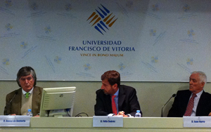 El acto estuvo presidido por Félix Suárez, director de Postgrado y Consultoría de la Universidad Francisco de Vitoria. Además contó con la participación de Juan Narro, director del curso y director de Actividades Académicas del Grupo ATENEA, y de Daniel Busturia, presidente del Consejo de Administración de la filial española de United Laboratories (Unilabs). En su intervención, Félix Suárez resaltó la importancia de la formación en inteligencia económica "por pura necesidad de supervivencia ante el mundo globalizado en el que nos encontramos". "Aunque no es fácil reunir a una serie de personas que quieran aprender inteligencia económica, somos pioneros de algo que va a ayudar mucho en las empresas", recalcó. De izquierda a derecha: Daniel de Busturia, Por último, Daniel de Busturia incidió en la importancia que tienen los departamentos de análisis en las empresas, aunque éstas aún no se han dado cuenta. Y dejó muy claro que "para que la inteligencia se ejerza necesita de fuentes de información y de definición de objetivos que justifiquen un escenario de decisión.